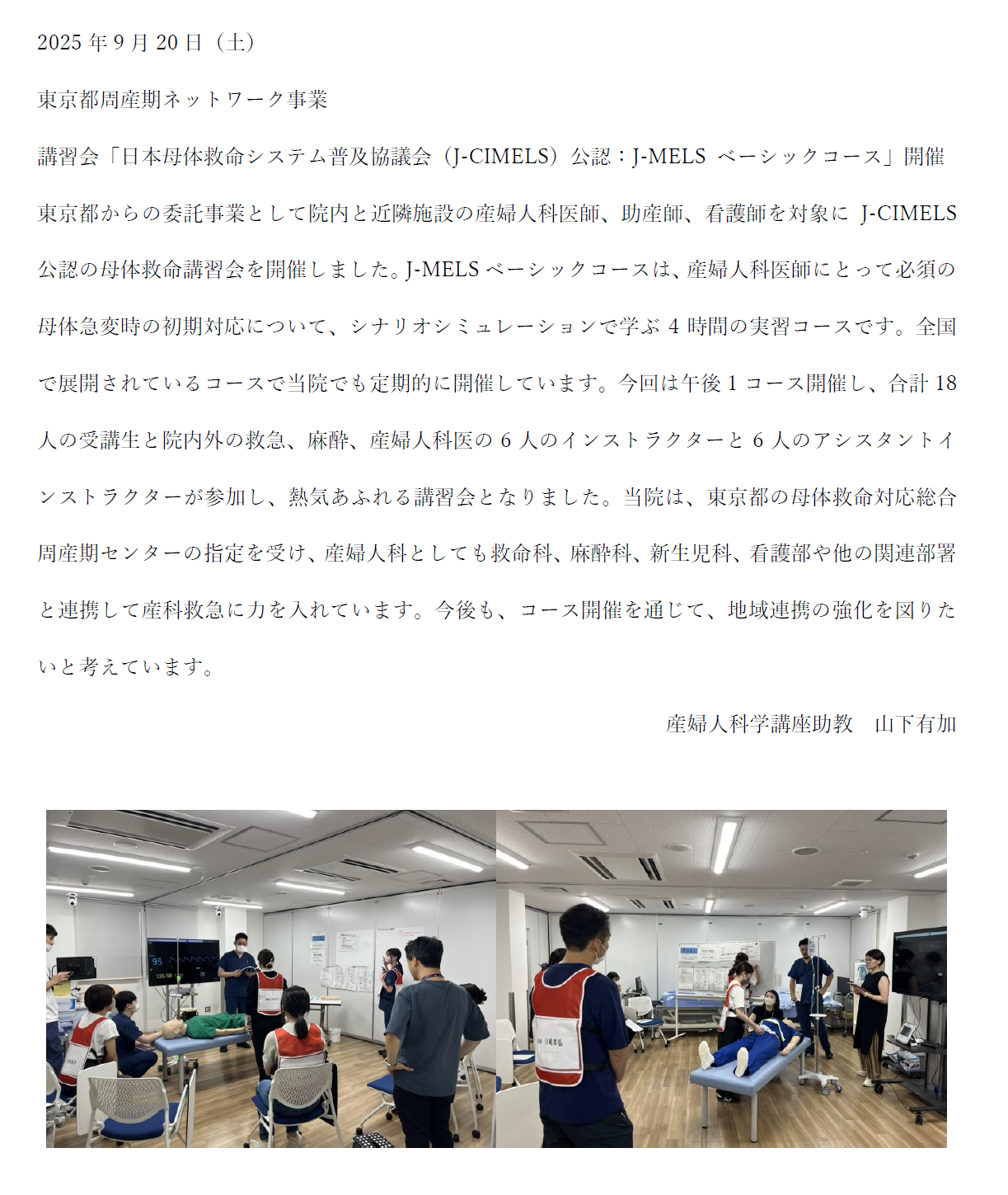 2025年9月20日(土) 講習会「日本母体救命システム普及協議会(J-CIMELS)公認:J-MELS ベーシックコース」開催